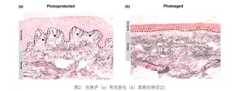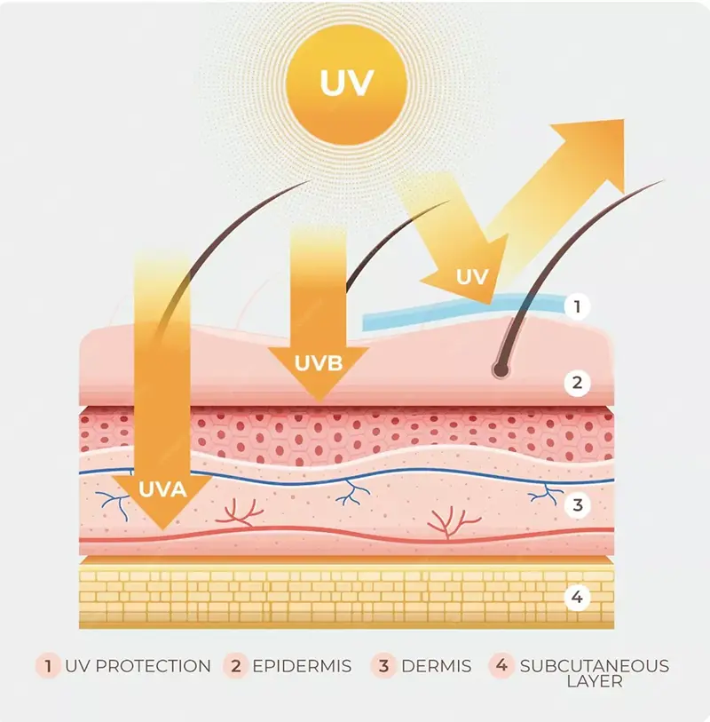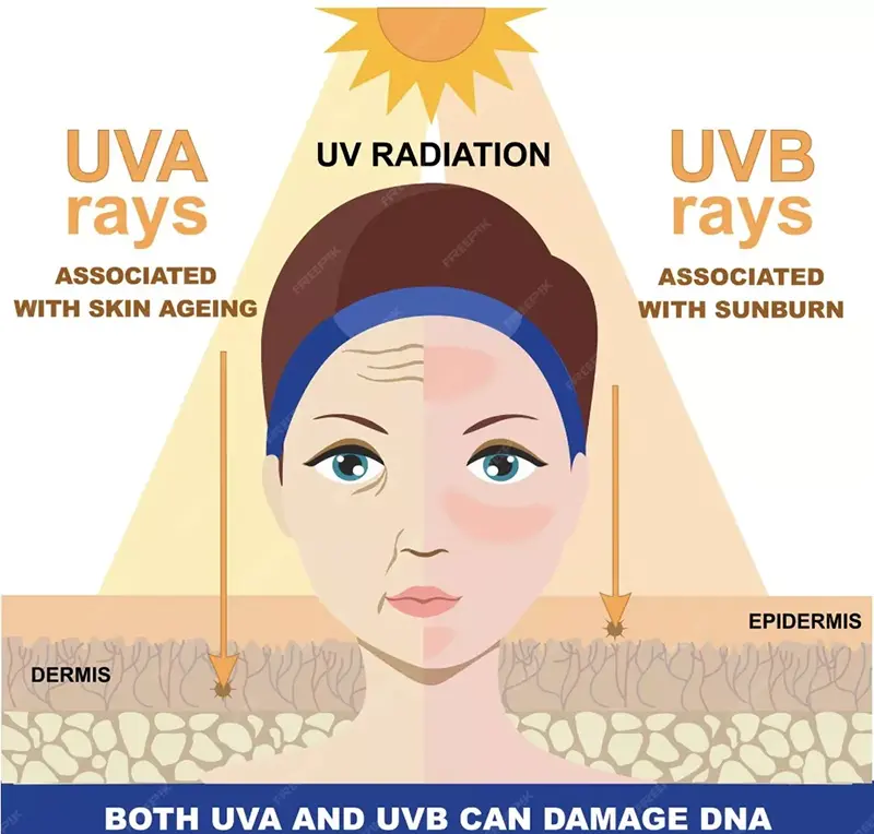 И UVA, и UVB могут вызвать повреждение кожи, но их воздействие различно, главным образом, из-за глубины проникновения. Очевидно, что более богатые UVA-лучи могут проникать глубже в дерму и более непосредственно связаны с фотостарением, поскольку они производят АФК и разрушают коллаген и эластин, что приводит к появлению морщин, потере эластичности кожи и другим признакам преждевременного старения. Напротив, УФВ в основном влияет на эпидермис, вызывая солнечный ожог (солнечную эритему) и выработку меланина в краткосрочной перспективе, тогда как длительное воздействие может привести к гиперкератозу и значительно увеличить риск возникновения злокачественных опухолей кожи.
