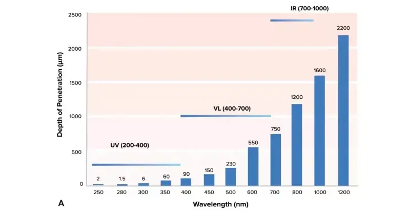 Как показано на рисунке выше, видимый свет оказывает большое влияние на кожу, поскольку эта полоса имеет более глубокую глубину проникновения в кожу. Красный свет может проникать через эпидермис и дерму и достигать жирового слоя, что указывает на взаимосвязь между длиной волны и глубиной проникновения и обратную зависимость между длиной волны и энергией, в то время как синий свет имеет более высокую энергию и меньшую глубину проникновения, чем красный свет.