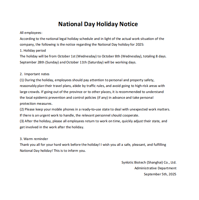 Уведомление о праздновании Национального дня и праздниках