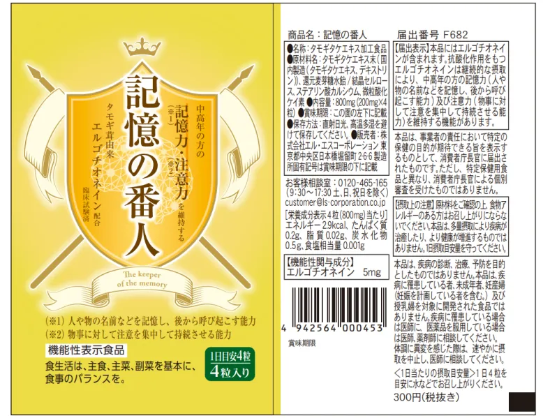 Добавка эрготионеина, выпущенная японской корпорацией LS, представляет собой продукт, предназначенный для решения проблемы снижения памяти у людей среднего и пожилого возраста.
