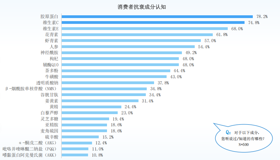 Благодаря образованию и развитию рынка коллаген в настоящее время является широко признанным среди потребителей «антивозрастным ингредиентом». В опросе, посвященном пониманию основных антивозрастных ингредиентов, коллаген (78,2%), витамин С (74,8%) и витамин Е (68%) входят в тройку лучших ингредиентов, которые потребители признают в составе пероральных антивозрастных продуктов. Среди пяти наиболее популярных антивозрастных ингредиентов в разных возрастных группах коллаген, несомненно, является «звездным ингредиентом».